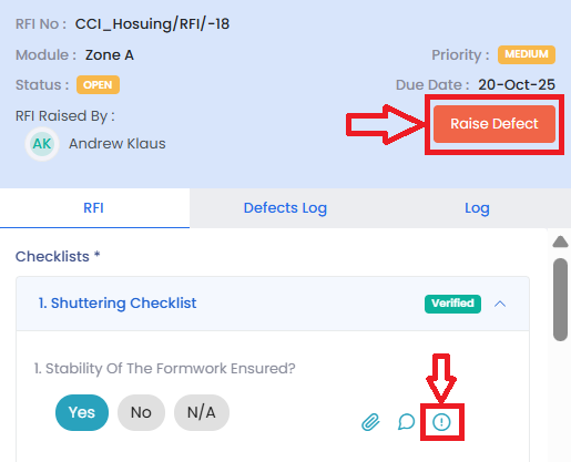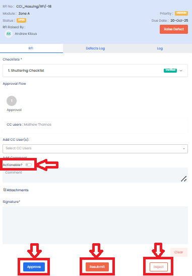 - Based on the inspection results, you can Approve, Reject, or Resubmit the RFI.