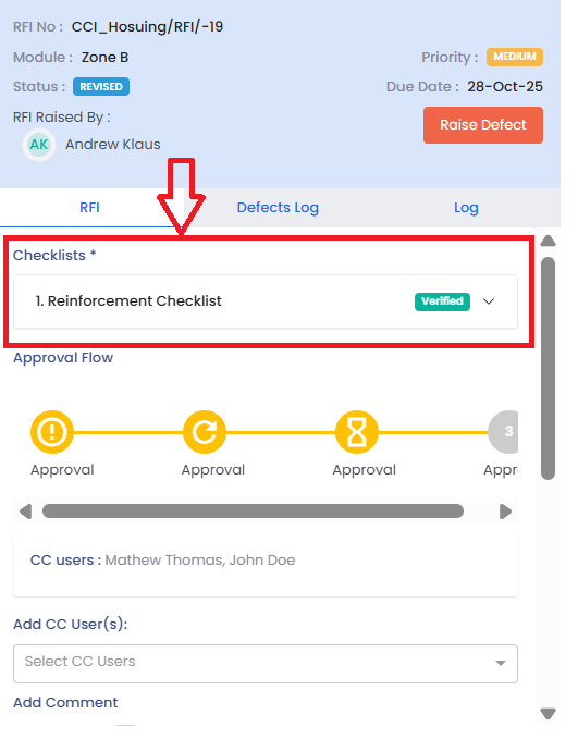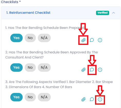 - For each checklist line item, you’ll see options to Attach, Comment, and Raise Defect.