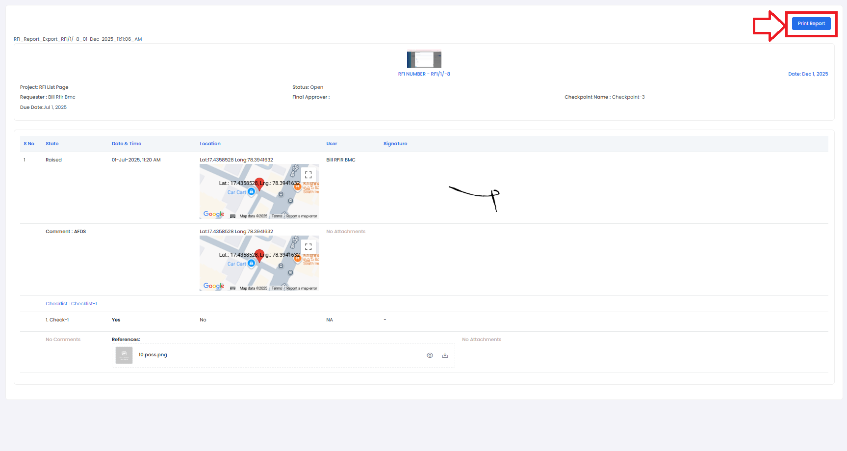 - Click on the respective RFI to view its detailed report and log.