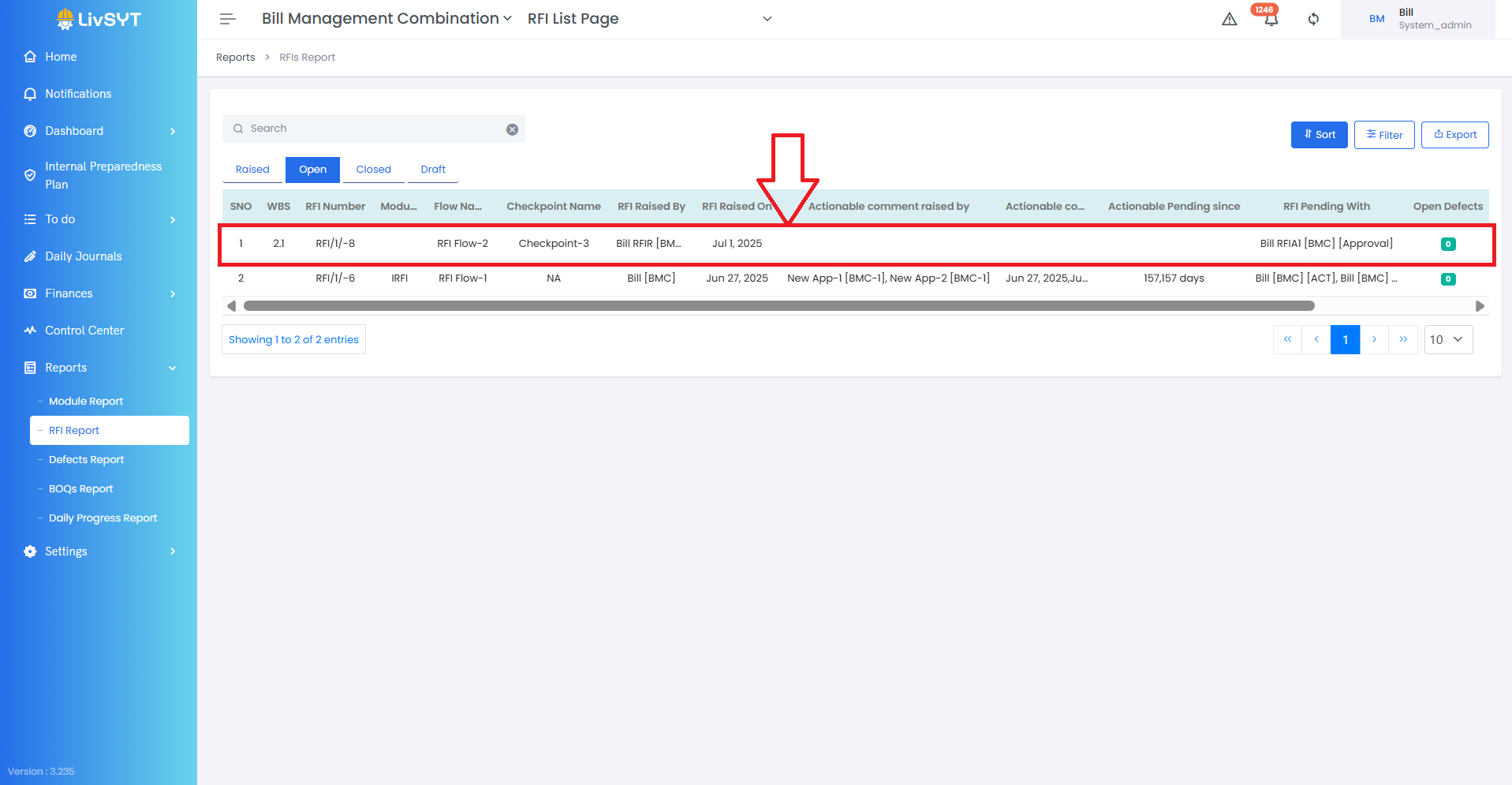 - You can find RFIs categorized under Raised, Open, Closed, and Draft sections.