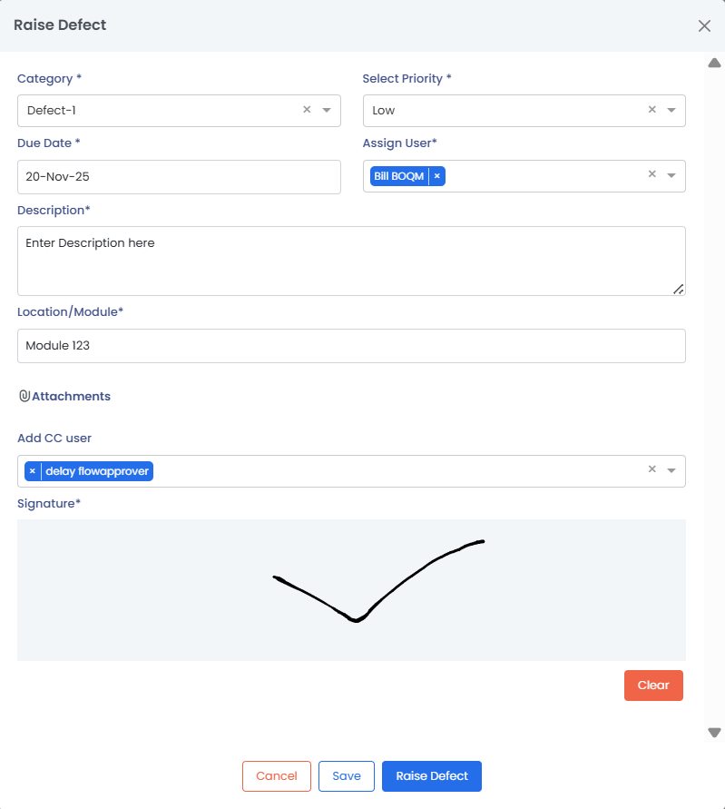 - To submit it later, open the draft → click Edit → add your signature → click Raise Defect.