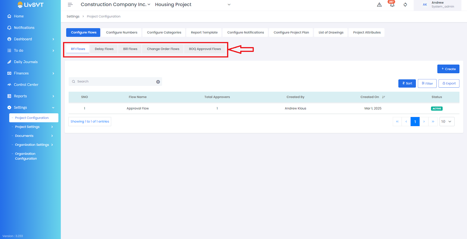- Under Project Configuration, go to RFI / Bill / Change Order / BOQ Approval Flow.